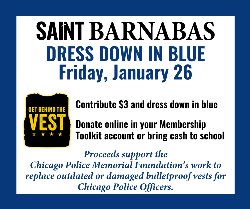 Students may dress down in blue and contribute $3 to support Get Behind the Vest. Contribute online in your Membership Toolkit account or bring cash donation to school..