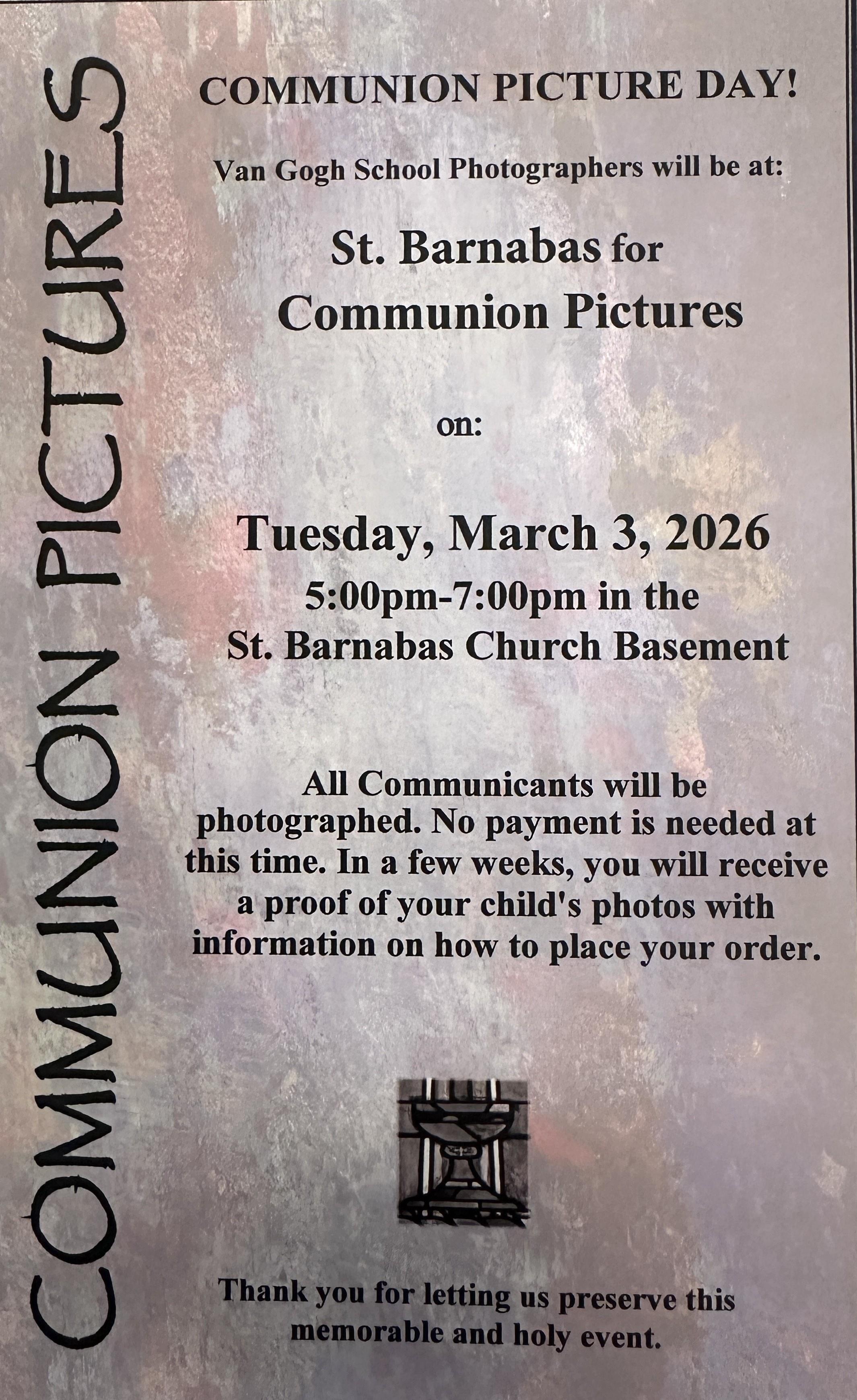 On Tuesday, March 3, from 5pm - 7pm, the 2nd-grade students are invited to the Church Hall, dressed in their First Communion attire, for a portrait session with Van Gogh Photographers.