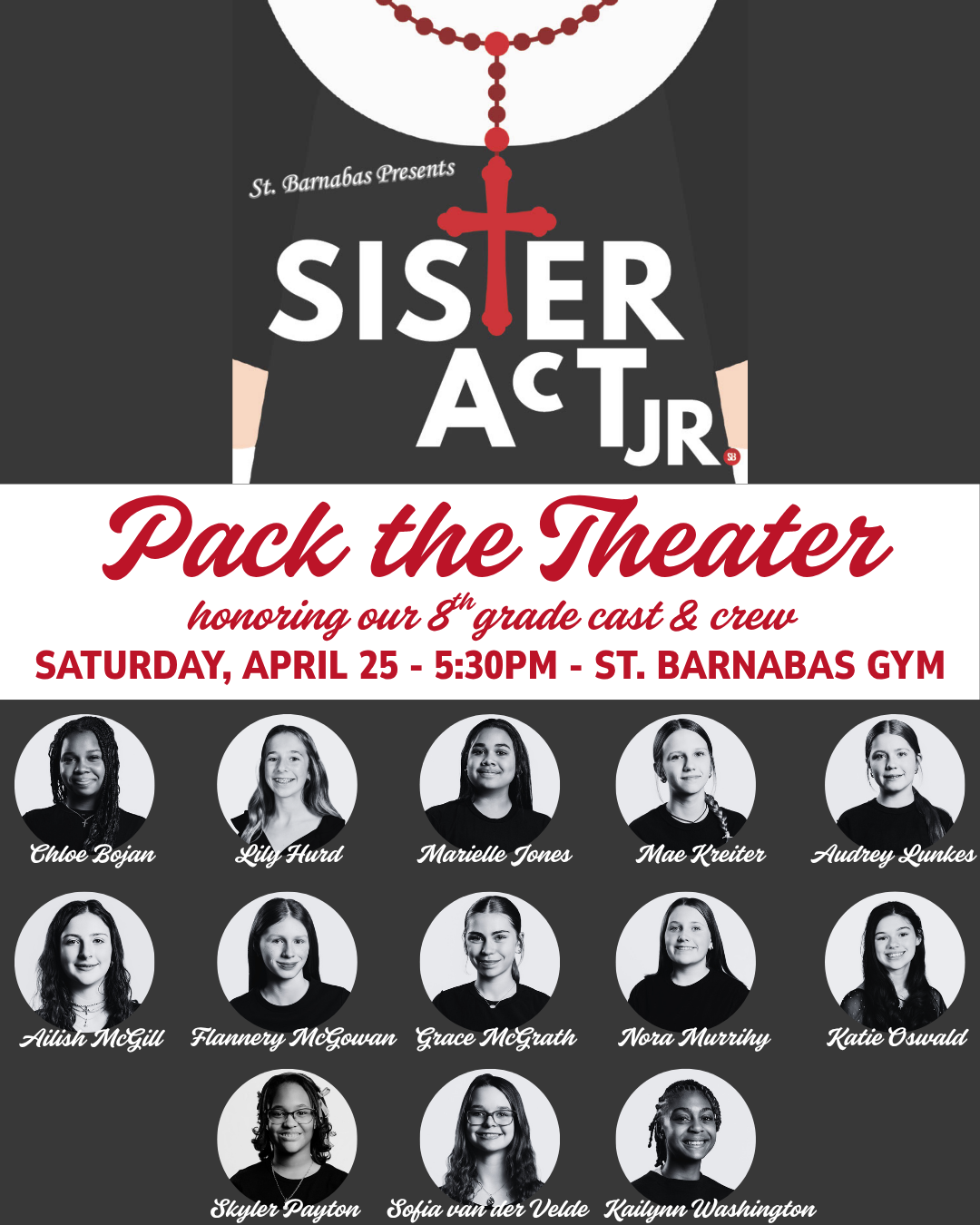 Pack the Theater - April 25 Saturday, April 25 at 5:30pmLet's honor our 8th-grade cast and crew members at their final St. Barnabas performance!