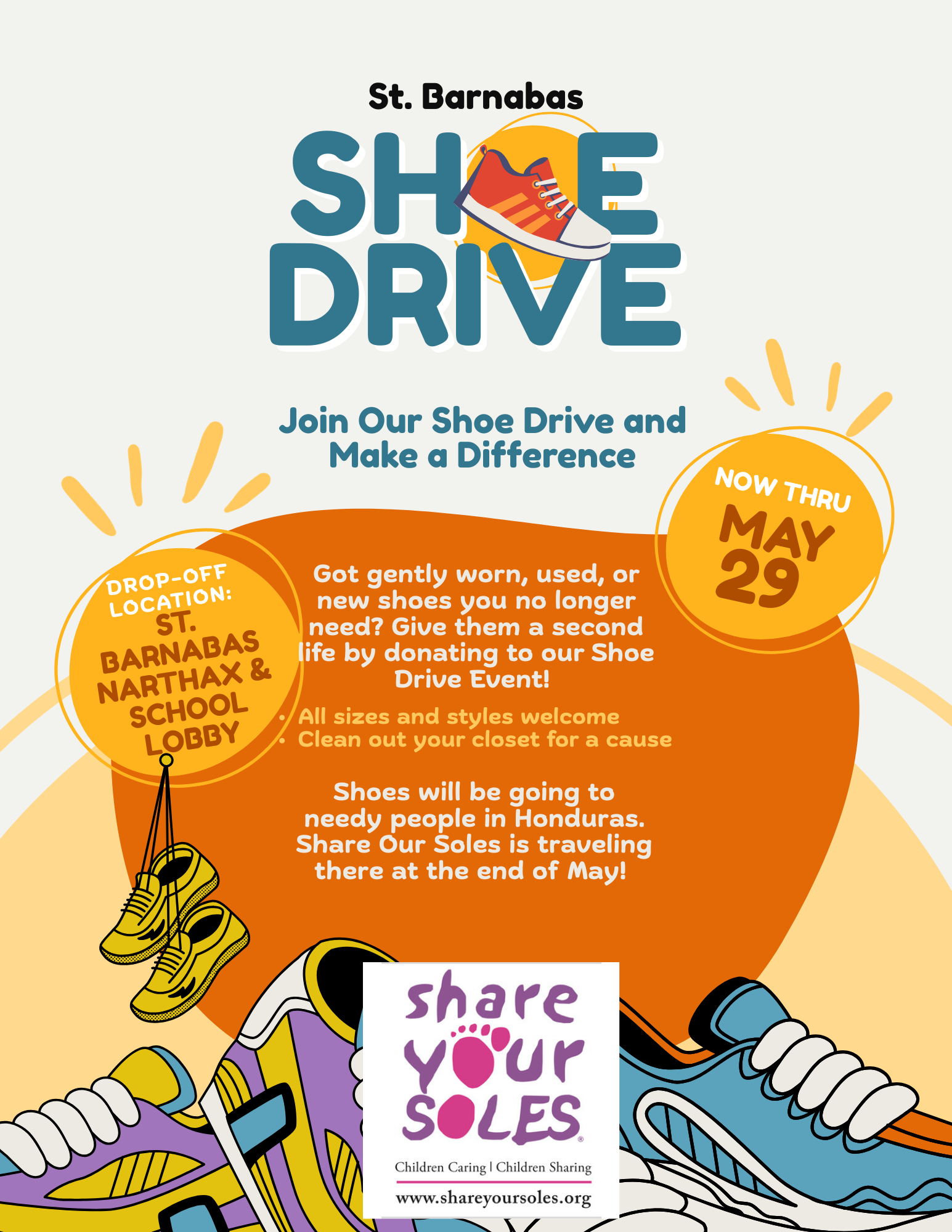Share Your Soles, one of the organizations we support for our annual Service Day, has an urgent need for shoes. If you're doing some spring cleaning and have shoes (child or adult size) that no longer fit our household, please drop them off at the collection bin in our Main Hall. Donations will be accepted through May 29.